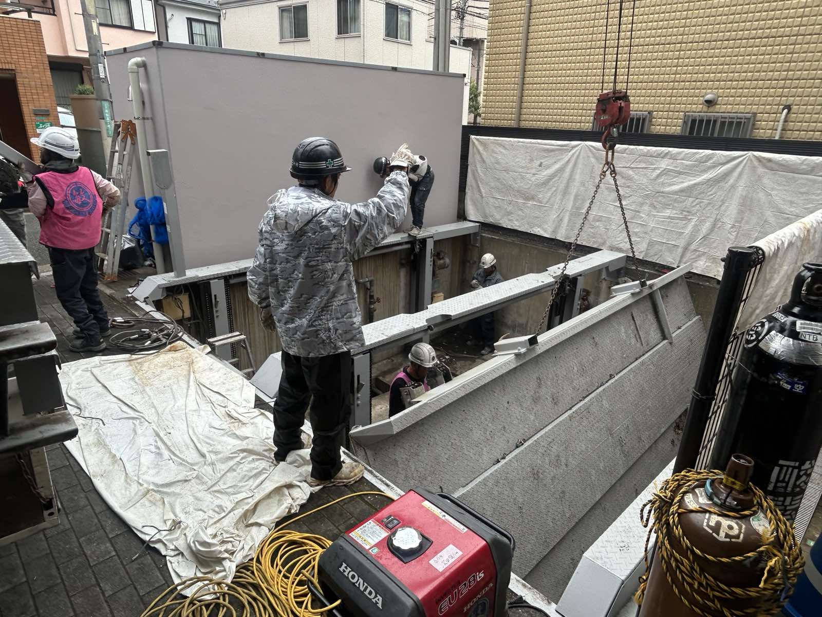 前面道路の道幅が狭く、搬入・搬出の際には警備員以外にも作業員で周囲の確認をし、より一層気をつけて作業を進めました。