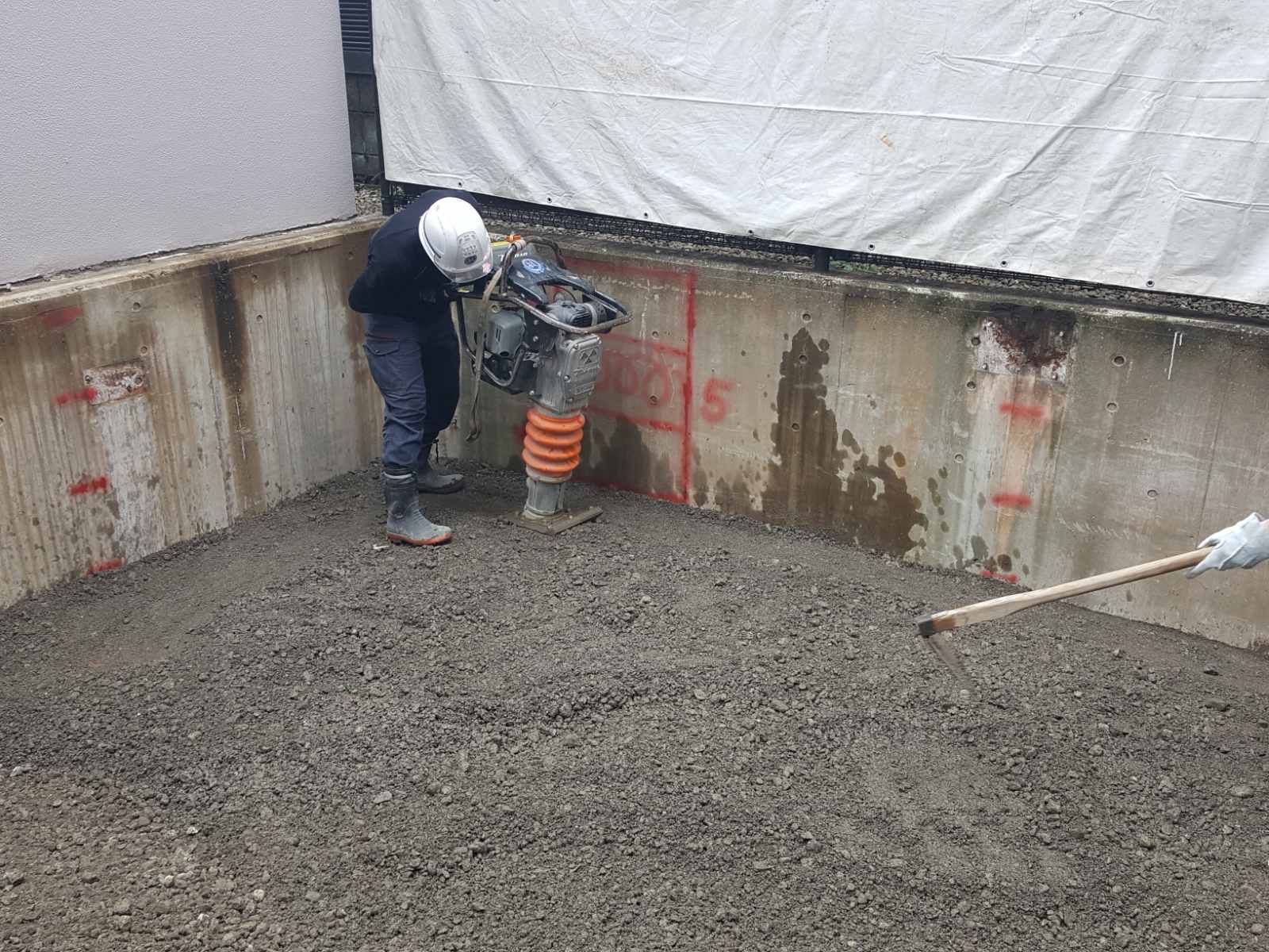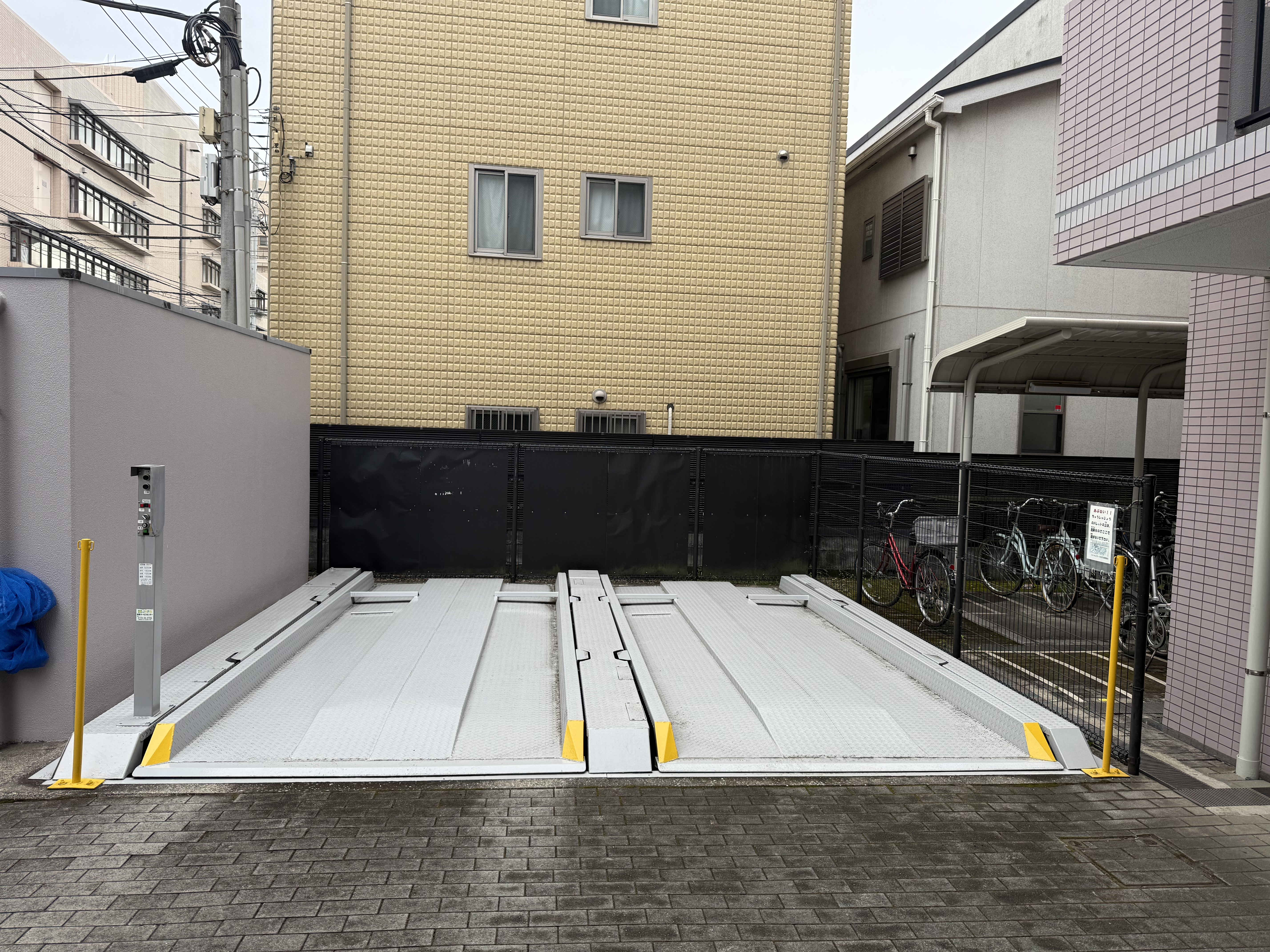 担当 助川 亮 竣工 2025年8月 機械式駐車場2連×2段式の解体 砕石敷設 転圧 コンクリート舗装にて2台分の平面化工事を行いました。 前面道路の道幅が狭く、搬入・搬出の際には警備員以外にも作業員で周囲の確認をし、より一層気をつけて作業を進めました。 解体初日は雨でパレットが滑りやすかったため、安全に留意し作業を行い、予定よりも進みがよく無事にお引渡しができました。 駐車ライン引き(塗装)の作業は、コンクリート打設後の含水率の高い状態で施工をしてしまうと早期剥離の原因となりますので、 弊社では乾燥養生期間を1ヵ月程度設けた後に施工を行い、長期間メンテナンスの不要な駐車場造成を心がけております。 施工前 機械式駐車装置 解体 水抜き穴 削孔 砕石敷設 転圧 鉄筋配筋 コンクリート打設後 車止め設置