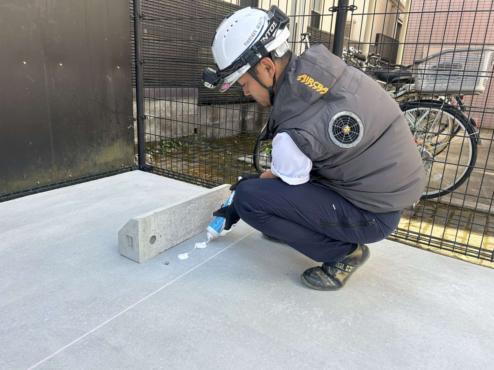 駐車ライン引き(塗装)の作業は、コンクリート打設後の含水率の高い状態で施工をしてしまうと早期剥離の原因となりますので、