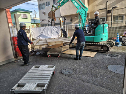 担当 古川 敏史 竣工 2025年11月 外部駐車場:1連機×2段×2機、2連機×2段 内部駐車場:1連機×2段、3連機×2段 合計5ピット16台分の機械式駐車装置を解体し、 8台分のアスファルト平面駐車場に造成いたしました。 高さ制限があり、解体時の揚重機だけではなく砕石投入時のダンプアップもできないため、クローラークレーンを使用して施工いたしました。 内部駐車場横には駐輪場があり、居住者様の動線を確保するだけでなく周囲の安全には十分注意をして作業を進めてまいりました。 機械式駐車装置 解体 機械式駐車装置 搬出 洗浄 砕石敷設・転圧 アスファルト舗装 車止めブロック設置 ライン引き
