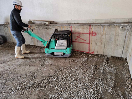 高さ制限があり、解体時の揚重機だけではなく砕石投入時のダンプアップもできないため、クローラークレーンを使用して施工いたしました。